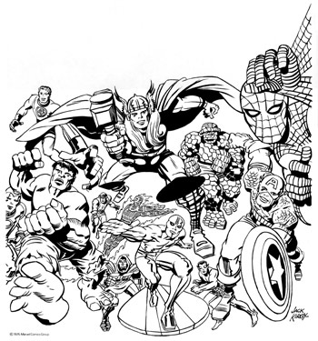 After serving in World War II (fighting under General George S. Patton and almost losing both his legs due to frostbite in the famous battle of Bastone), Kirby returned to comics and worked in a variety of genres. He produced work for a number of publishers, including DC Comics, Harvey Comics, Hillman Periodicals and Crestwood Publications, where he and Simon created the genre of romance comics. They also launched their own short-lived comic company, Mainline Publications. Kirby ultimately went on his own and found himself at Timely's 1950's iteration, Atlas Comics, soon to become Marvel Comics. There, in the 1960's, he and writer-editor Stan Lee co-created many of Marvel's major characters (widely considered some of the greatest fictional characters ever), including The Fantastic Four, Iron Man, Thor, Silver Surfer, The X-Men, The Avengers, The Hulk and many others to give birth to the Marvel Universe. Cranking out hit after hit, the duo quickly became the greatest writer/artist team in the history of the medium. Nicknamed simply as "King" by Lee (and his peers) for his unmatched creativity and work, Kirby still felt treated unfairly. Despite the high sales and critical acclaim of the Lee/Kirby titles, Kirby left the company in 1970 for the rival DC Comics.